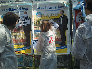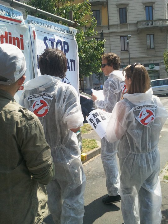 Moratti, ma non solo: stanchi di dover subire le angherie di tutti quei candidati buoni solo ad imbrattare le plance, una pattuglia di radicali, indossata la tuta da lavoro da 'Acchiappabusivi' e guidata dal segretario nazionale di Radicali Italiani Mario Staderini, ha cominciato un'opera di segnalazione alla cittadinanza dei reati commessi dai loro concorrenti. Armati di cartelli e di colla, sono andati a verificare le proprie postazioni e, dove hanno trovato imbrattatori, hanno sovrapposto una mini-manifesto con su scritto 'Manifesto abusivo: 416 euro' (valore della multa che dovrebbe essere inferta ai trasgressori).