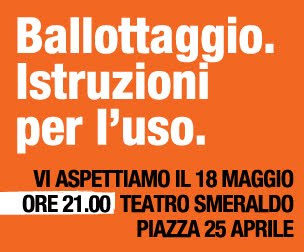 Subito dopo ci traferiremo al Teatro Smeraldo per incontrare il comitato elettorale di Pisapia e i rappresentanti delle altre liste che lo sostengono, in modo da coordinare le iniziative dei prossimi, decisivi, dieci giorni. In questa occasione verrà distribuito ai presenti materiale elettorale di Pisapia. Appuntamento mercoledì 18 maggio alle ore 21, presso il Teatro Smeraldo in piazza XXV Aprile 10 (MM2 Moscova) a Milano.