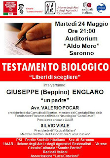 Domani sera il Circolo 'Sandro Pertini', la UAAR della Provincia di Varese, il PSI di Saronno, Radicali Italiani e l'Associazione Luca Coscioni organizzano il dibattito dal titolo 'Testamento biologico: liberi di scegliere. Partecipano: Beppino Englaro, padre di Eluana Englaro; avv. Valerio Pocar, presidente della Consulta di Bioetica, membro del Comitato Etico della Fondazione Florian e dell'Istituto Neurologico 'Carlo Besta', presidente onorario UAAR; Silvio Viale, presidente di Radicali Italiani e membro direttivo dell'Associazione Luca Coscioni.