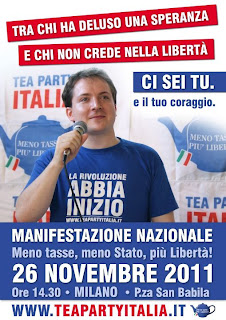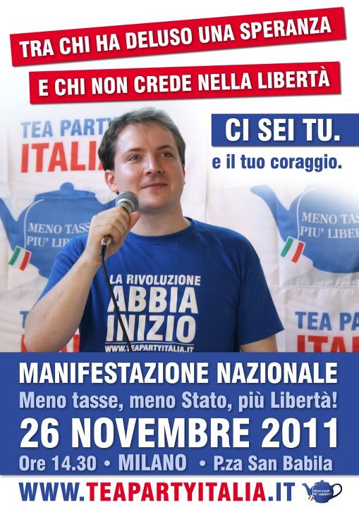 Domani pomeriggio il Tea Party Italia, referente ufficiale per l'Europa dei Tea Party Patriots USA, organizza una manifestazione a cui aderiscono moltissimi movimenti e associazioni liberali italiane. È la prima manifestazione nazionale di tutti i Tea Party del nostro paese contro l'invasione dello stato nella vita dei cittadini, contro un fisco oppressivo e una politica incapace di agire per il bene del paese. Un'occasione importante per per dire no a gran voce ad ulteriori tasse: no ad ulteriori aumenti dell'IVA, no all'ICI e no alle patrimoniali. Sì a riforme coraggiose in senso liberale, sì ai tagli alla spesa pubblica, sì alle liberalizzazioni e alla riduzione del carico fiscale.