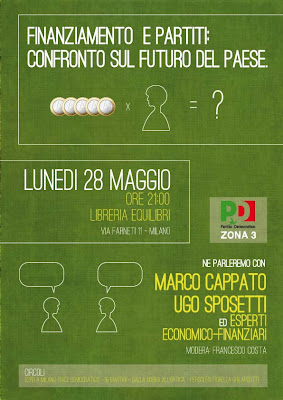 Lunedì sera i circoli del Partito Democratico della Zona 3 di Milano organizzano un dibattito pubblico dal titolo 'Finanziamento e partiti: confronto sul futuro del paese', per approfondire i diversi modelli adottabili di finanziamento ai partiti, anche oltre gli aspetti contingenti. Partecipano: Marco Cappato, consigliere comunale del Gruppo Radicale - Federalista europeo a Milano e tesoriere dell'Associazione Luca Coscioni; Ugo Sposetti, senatore del Partito Democratico e già tesoriere dei Democratici di Sinistra. Modera: Francesco Costa, giornalista.