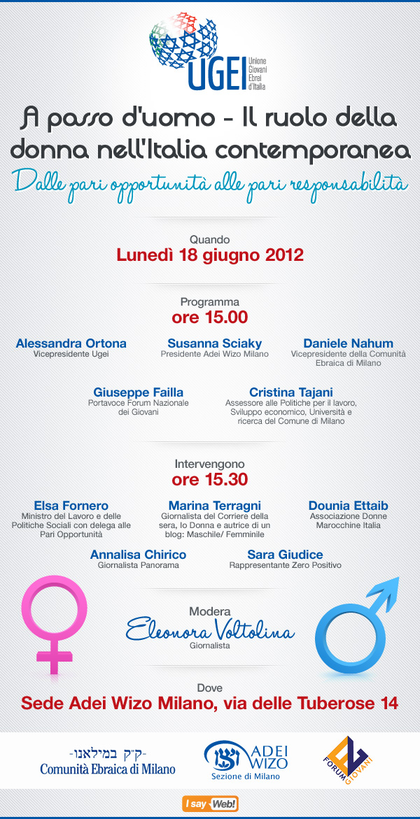 Lunedì prossimo l'Unione Giovani Ebrei d'Italia (UGEI) organizza un convegno dal titolo 'A passo d'uomo, il ruolo della donna nell'Italia contemporanea – Dalle pari opportunità alle pari responsabilità'. Partecipano: Annalisa Chirico, giornalista e membro del Comitato Nazionale di Radicali Italiani; Daniele Nahum, vicepresidente della Comunità Ebraica di Milano; Alessandra Ortona, vicepresidente dell'UGEI; Susanna Sciaky, presidente dell'Adei Wizo Milano; Giuseppe Failla, portavoce del Forum Nazionale dei Giovani; Cristina Tajani, assessore alle Politiche del lavoro, Sviluppo economico, Università e ricerca del Comune di Milano; Marina Terragni, giornalista; Dounia Ettaib, esponente dell'Associazione Donne Marocchine Italia; Sara Giudice, rappresentante di Zero Positivo; Elsa Fornero, ministro del Lavoro e delle Politiche Sociali con delega alle Pari Opportunità. Modera: Eleonora Voltolina, giornalista.