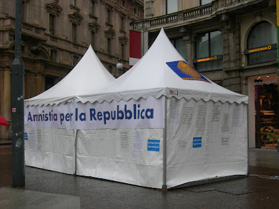 Venerdì scorso abbiamo inaugurato la seconda edizione del Radical Party, un punto di ritrovo a disposizione di tutti i soggetti costituenti del Partito Radicale Nonviolento Transnazionale e Transpartito proprio nel centro di Milano. Nel fine settimana il gazebo in piazza Cordusio ha ospitato due importanti e partecipati appuntamenti: sabato pomeriggio il deputato radicale Maurizio Turco, il pastore valdese Giuseppe Platone e il cattolico conciliare Vittorio Bellavite si sono confrontati su 'Religioni e libertà religiose, chiese e stato' (la registrazione integrale del dibattito è disponibile sul sito di Radio Radicale a questo link); domenica sera l'Associazione Radicale Certi Diritti ha organizzato un incontro con la neuropsichiatra Roberta Ribali su identità di genere, transessualità e trans-genderismo dal titolo 'Varianza, non devianza'. Le fotografie di questi tre intensi giorni sono visibili qui, qui e qui.