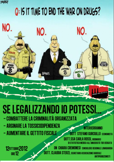 Domani l'associazione culturale studentesca Anime Salve Spa organizza un dibattito sull'antiproibizionismo dal titolo 'Se legalizzando io potessi...'. Partecipano: Stefano Gurciullo, economista e co-redattore del sito Quattrogatti.info; Carla Rossi, ordinaria di statistica medica presso l'Università di Roma Tor Vergata e rappresentante del Parlamento Europeo nel Consiglio di amministrazione dell'Osservatorio europeo sulle droghe e tossicodipendenza (EMCDDA); Chiara Cremonesi, consigliere regionale di Sinistra Ecologia e Libertà in Lombardia; Claudia Sterzi, segretaria dell'Associazione Radicale Antiproibizionisti; Eleonora Montani, docente di criminologia presso l'Università Bocconi. Modera: Laura Cesaris, docente di procedura penale presso l'Università Bocconi.