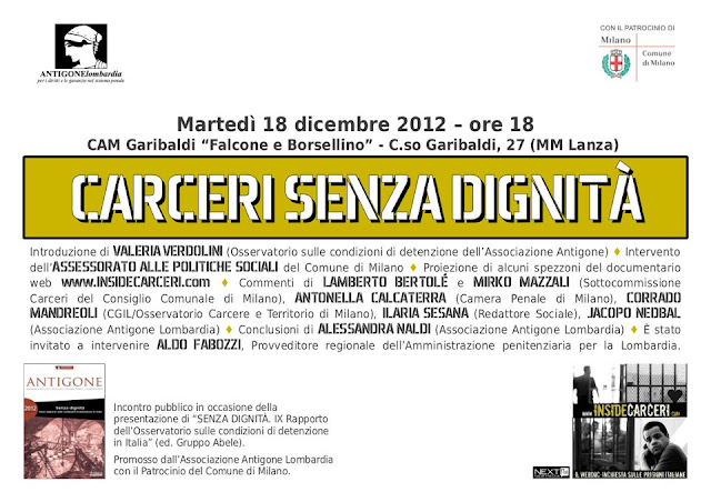 Martedì prossimo l'Associazione Antigone, con il patrocinio del Comune di Milano, organizza un incontro pubblico a Milano per presentare il IX Rapporto del suo Osservatorio sulle condizioni di detenzione in Italia (Edizioni Gruppo Abele). Partecipano: Lamberto Bertolé (PD) e Mirko Mazzali (SEL), membri della Sottocommissione Carceri del Consiglio Comunale di Milano; Antonella Calcaterra, avvocato della Camera Penale di Milano; Corrado Mandreoli, rappresentante dell'Osservatorio Carcere e Territorio di Milano della CGIL; Ilaria Sesana, giornalista dell'agenzia Redattore Sociale; Jacopo Nedbal, membro dell'Associazione Antigone Lombardia. Introduce: Valeria Verdolini, Osservatorio sulle condizioni di detenzione dell'Associazione Antigone. Conclude: Alessandra Naldi, Associazione Antigone Lombardia. È stato inoltre invitato a intervenire Aldo Fabozzi, Provveditore regionale dell'Amministrazione Penitenziaria per la Lombardia. Durante l'incontro verranno proiettati alcuni spezzoni del documentario web Inside Carceri, prodotto da Next New Media e Associazione Antigone.