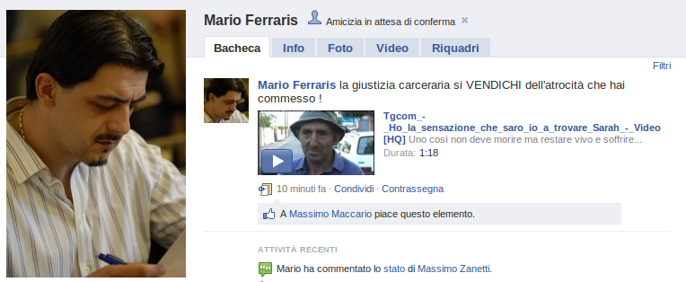Alle 14:30 di oggi il consigliere della Lista civica per Galvagno sindaco Mario Ferraris ha pubblicato sulla bacheca del proprio profilo di Facebook un link che rimanda ad una video intervista dell'omicida e zio di Sarah Scazzi con il seguente commento personale: la giustizia carceraria si VENDICHI dell'atrocità che hai commesso!