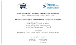 Lunedì prossimo l'Associazione Luca Coscioni [4] e la Fondazione Umberto Veronesi [5] organizzano una conferenza stampa sul tema 'Testamento biologico: libertà di sapere, libertà di scegliere'. Intervengono Emma Bonino [6], Marco Cappato [7], Amedeo Santosuosso, Umberto Veronesi. Per informazioni e accrediti: Marco Di Salvo, 347 0350986; Donata Francese, 02 89075019, 335 6150331.