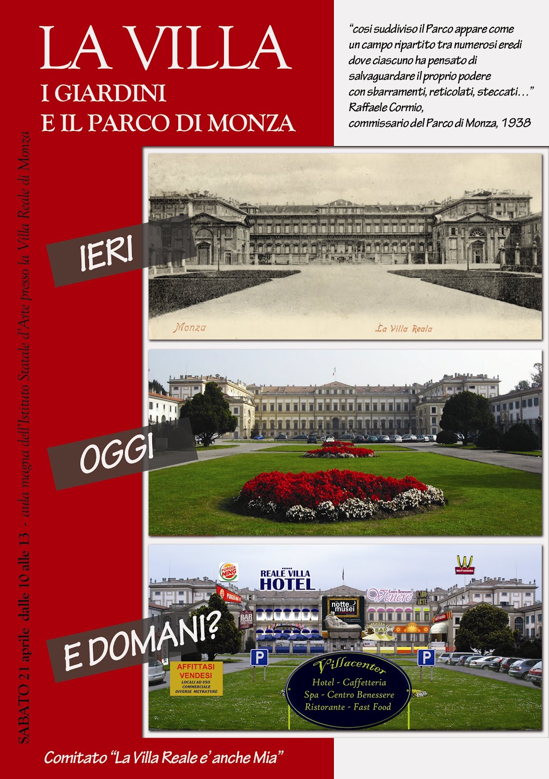 Sabato mattina il comitato La Villa Reale è anche mia organizza un convegno dal titolo La Villa, i Giardini e il Parco di Monza: ieri, oggi e… domani?, per fare il punto della situazione e approfondire la storia del Parco e della Villa Reale di Monza. Partecipano: Bianca Montrasio, membro del comitato 'La Villa Reale è anche mia'; Rodolfo Profumo, docente presso l'Istituto Statale d'Arte a Monza (Villa Reale ieri); Augusto Sanvito, dottore forestale e membro dell'Amministrazione Parco (Parco e Giardini oggi); Guido Soroldoni, preside dell'Istituto Statale d'Arte di Monza; Claudio Colombo, avvocato; Giorgio Majoli, membro di Legambiente (Villa Reale oggi); Roberto D'Achille, avvocato e portavoce del comitato 'La Villa Reale è anche mia' (Villa Reale e Parco domani?).